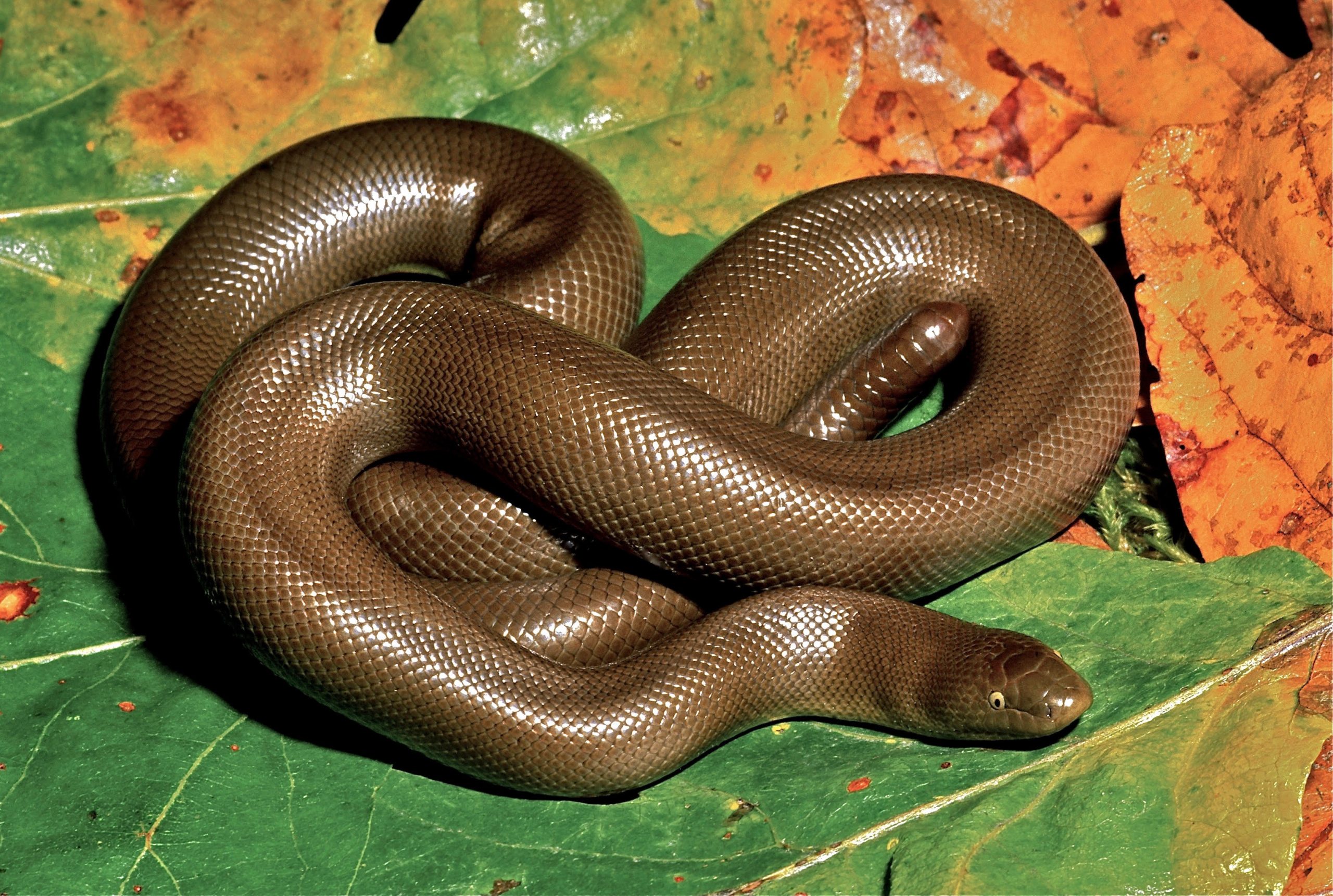 Smaller than its famously big tropical relatives (rarely more than 2 feet in length), this is the most northerly ranging boa species. The name is derived from its loose, rubbery skin. Also sometimes called the “two-headed snake” because of its distinctive blunt tail. Being slow-moving, shy, and never attempting to bite, when frightened a rubber boa merely rolls into a ball, protectively hiding the head under its coils. The hard-tipped, stubby tail is then protruded as a decoy “head” to attract biting predators away from more vulnerable body parts. Primarily feeds on small rodents, using constriction to kill prey.
