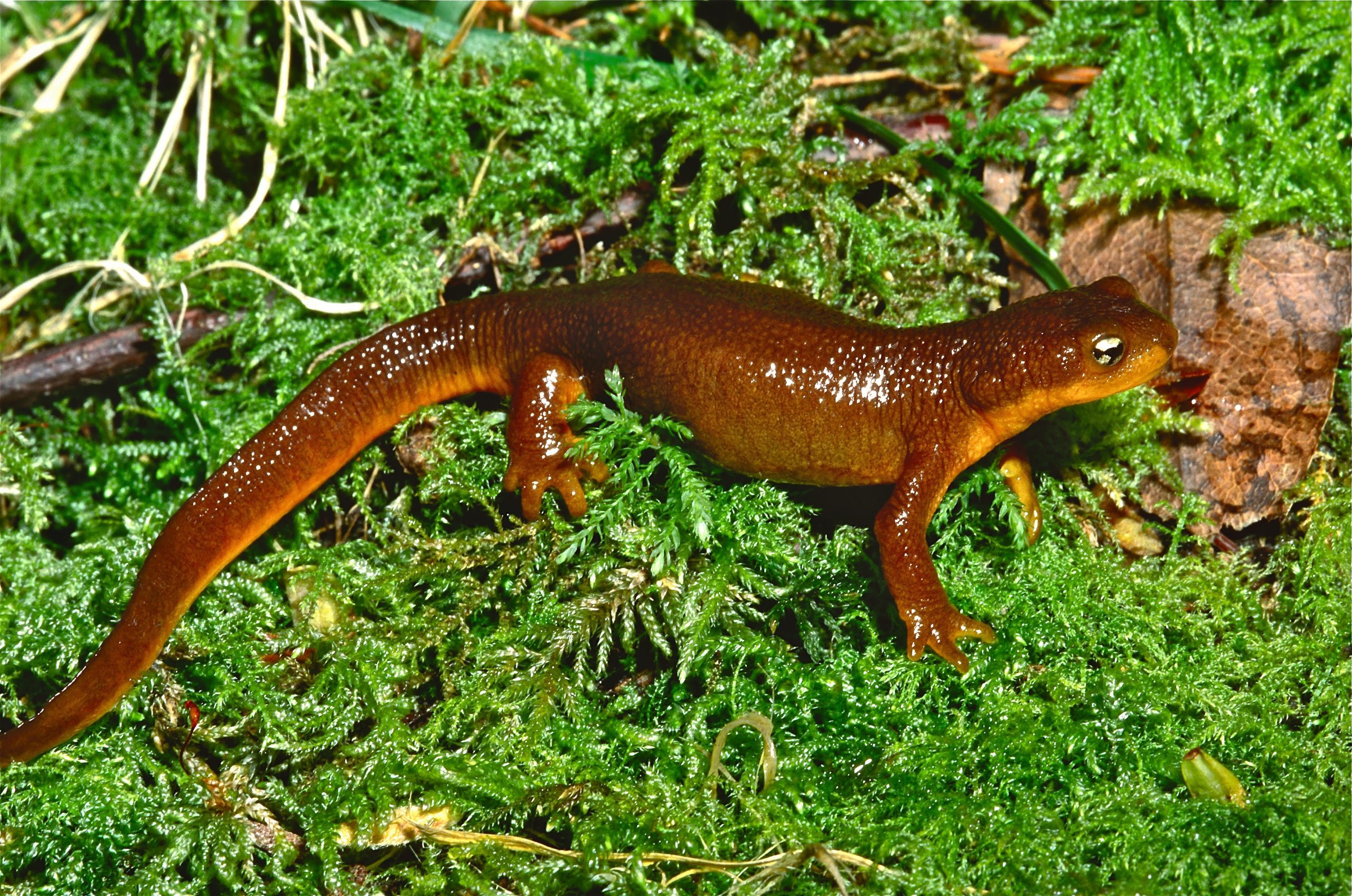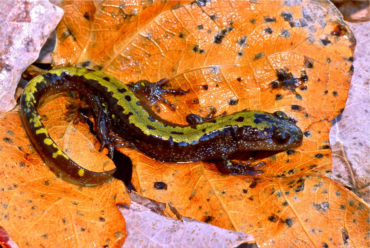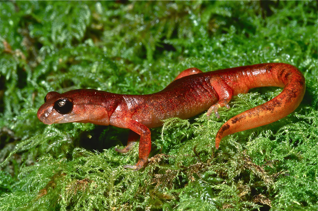 This is the most commonly seen salamander in the Pacific Northwest, often crossing roads day and night during rainy weather. The characteristic bumpy texture on its back is composed of small poison glands that secrete an extremely potent toxin when the newt feels threatened. Confronted with a predator, it arches its head and tail upward, exposing the colorful orangish-yellow undersides as a warning of, “Don’t eat me, I’m poisonous!” During late winter through spring, large numbers of newts gather in aquatic areas to breed. Some individuals remain in water year-round, but most move to the land after the egg-laying season, hiding under moist rotting logs and other surface cover. When handling this toxic amphibian, avoid touching your eyes and mouth, finishing with a soapy hand-washing.