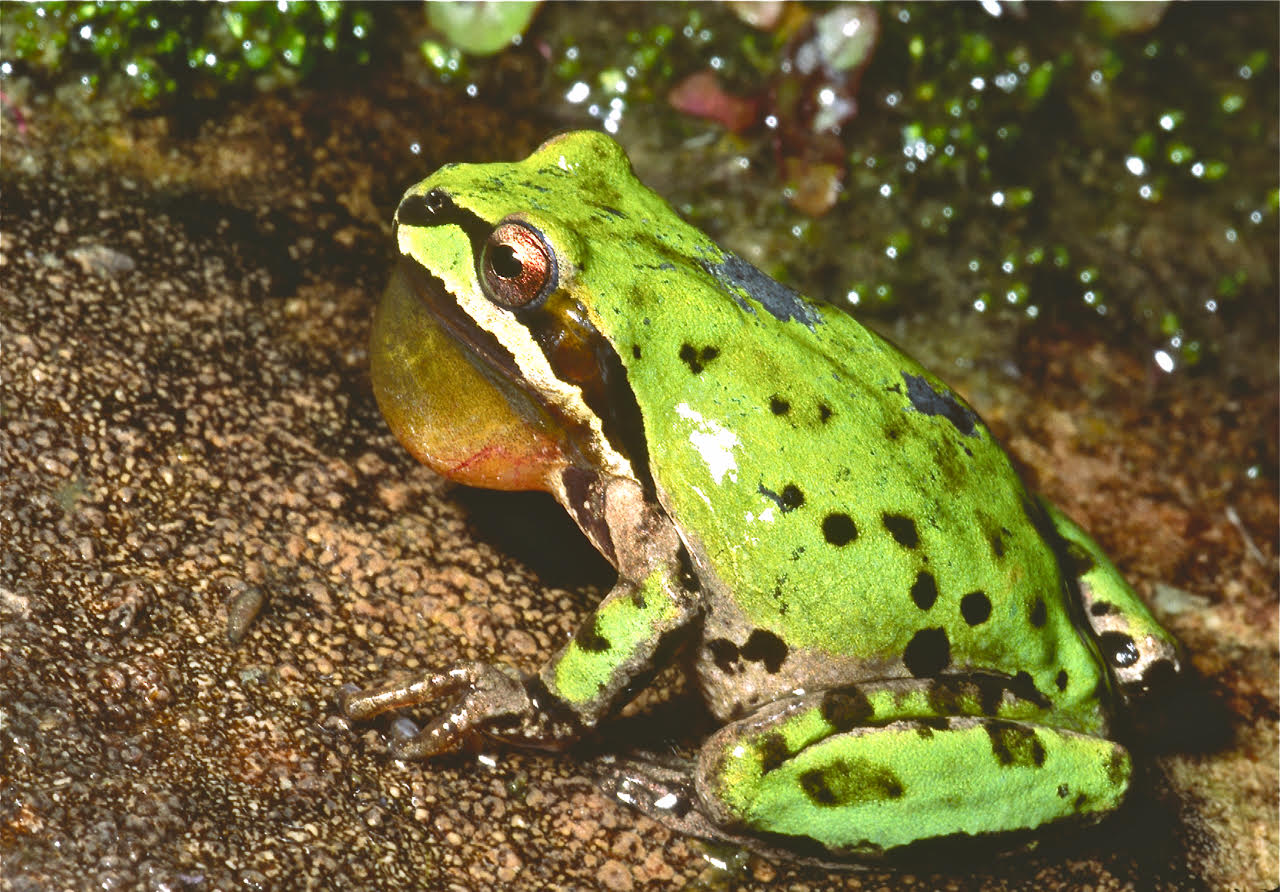 Although most of these dinky amphibians are bright green, some are tan, grayish-brown, pinkish-tan, reddish-bronze, or greenish-blue. No matter what color, all of them feature a dark eye-stripe “mask” and various brown to black mottlings and spots on the back. As the name indicates, they have suction-pad toes for climbing into trees and shrubs——and even up the smooth surface of glass! For such a small critter, they collectively have a BIG sound during the late-winter/early-spring breeding season. At that time, hundreds of treefrogs gather in shallow ponds, slow-moving streams, water-filled ditches, and temporary rain-pools to lay egg masses, the males calling with gusto as their throat-sack puffs in and out. Anyone who’s home is located by one of these mating frenzies may have difficulty sleeping because of the noise. Individually, this species’ call sounds like “creck-eck, creck-eck” repeated over and over.