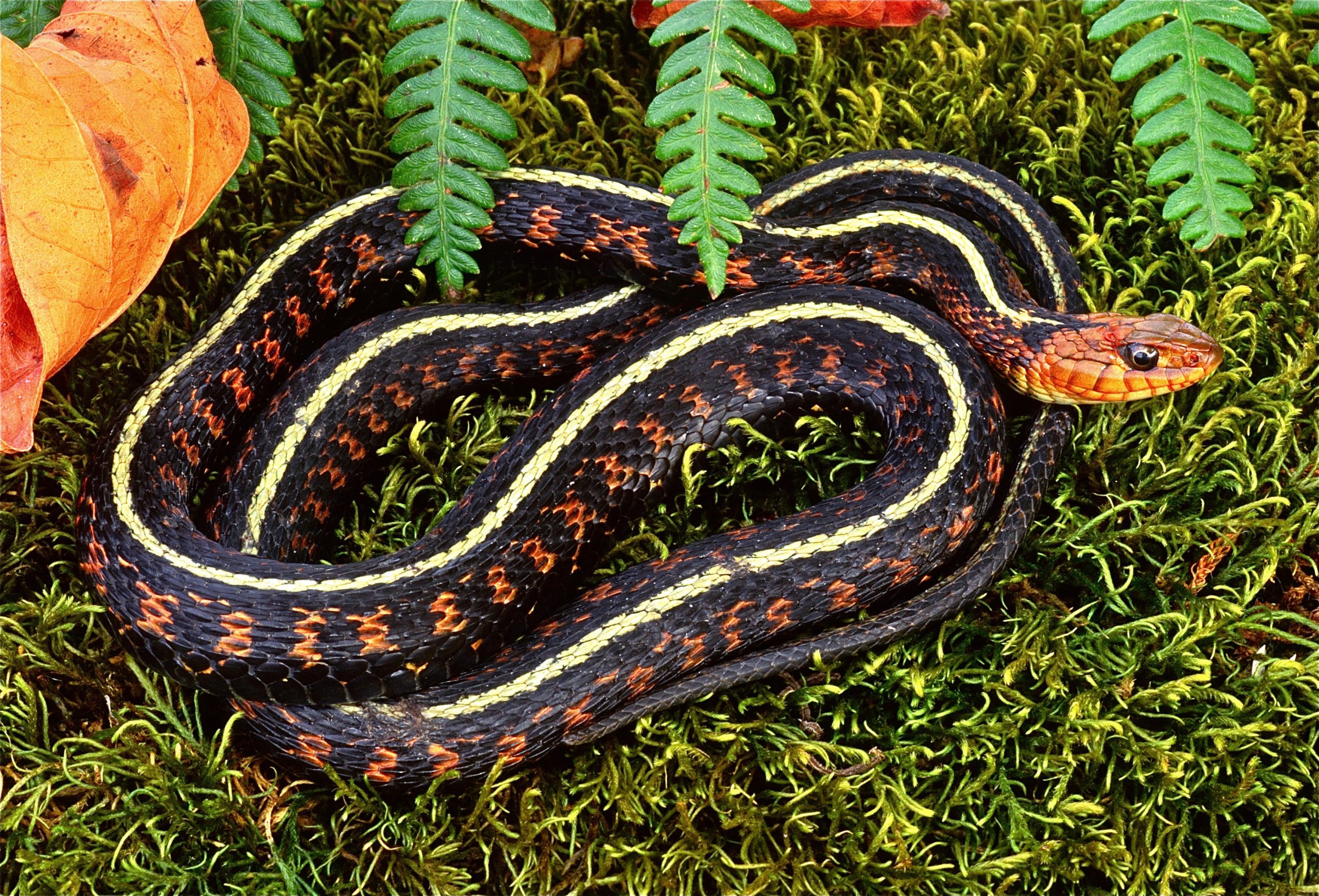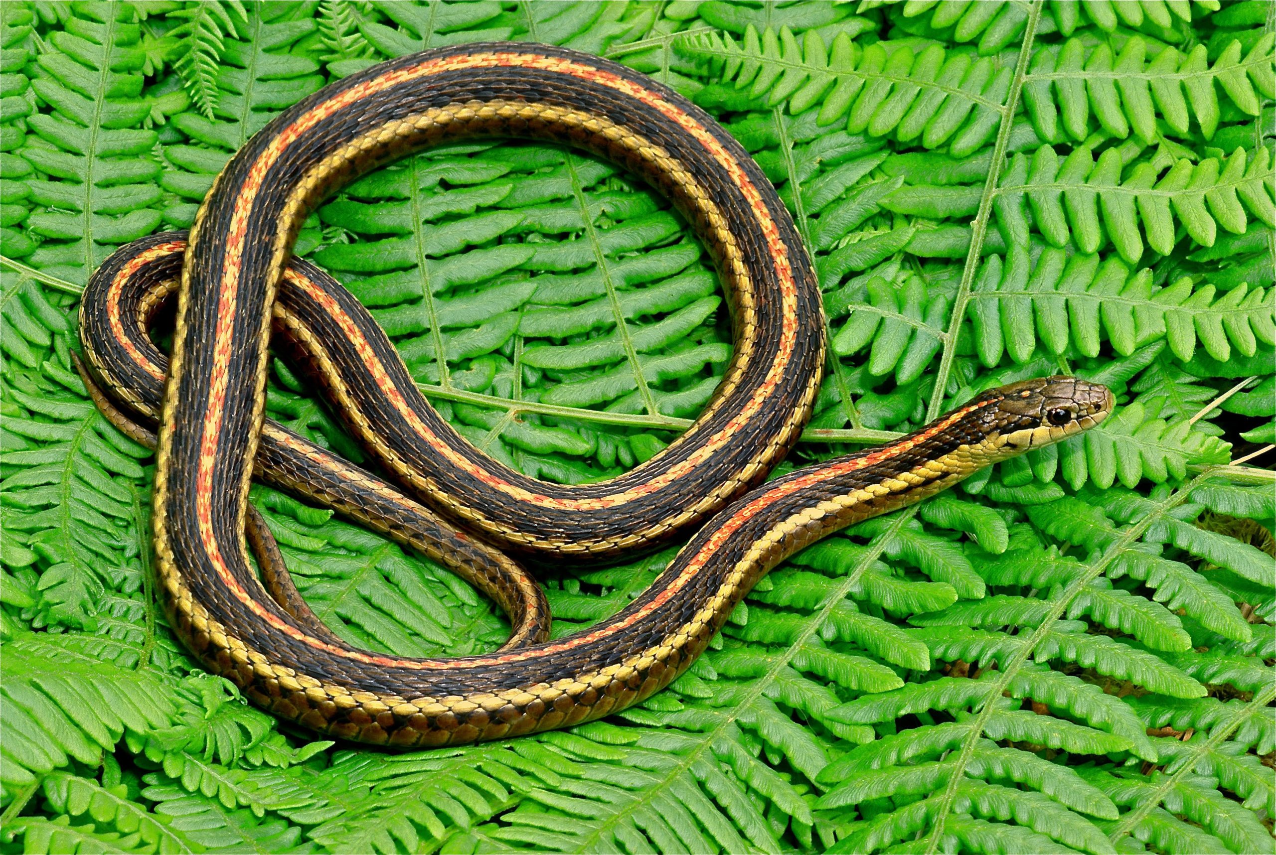 This is the most commonly seen snake species west of the Cascade Mountains, and can have red, orange, yellow, or greenish-blue stripes. Often encountered in backyards, it’s sometimes referred to as a “gardener snake.” That’s a well-earned name because its favored food is a garden pest—-slugs. So anyone attempting to grow vegetables should appreciate this reptile. Its diet also includes earthworms and snails, along with occasional small frogs and salamanders. Like all kinds of garter snakes, when handled it emits a foul-smelling musk to discourage a would-be captor.