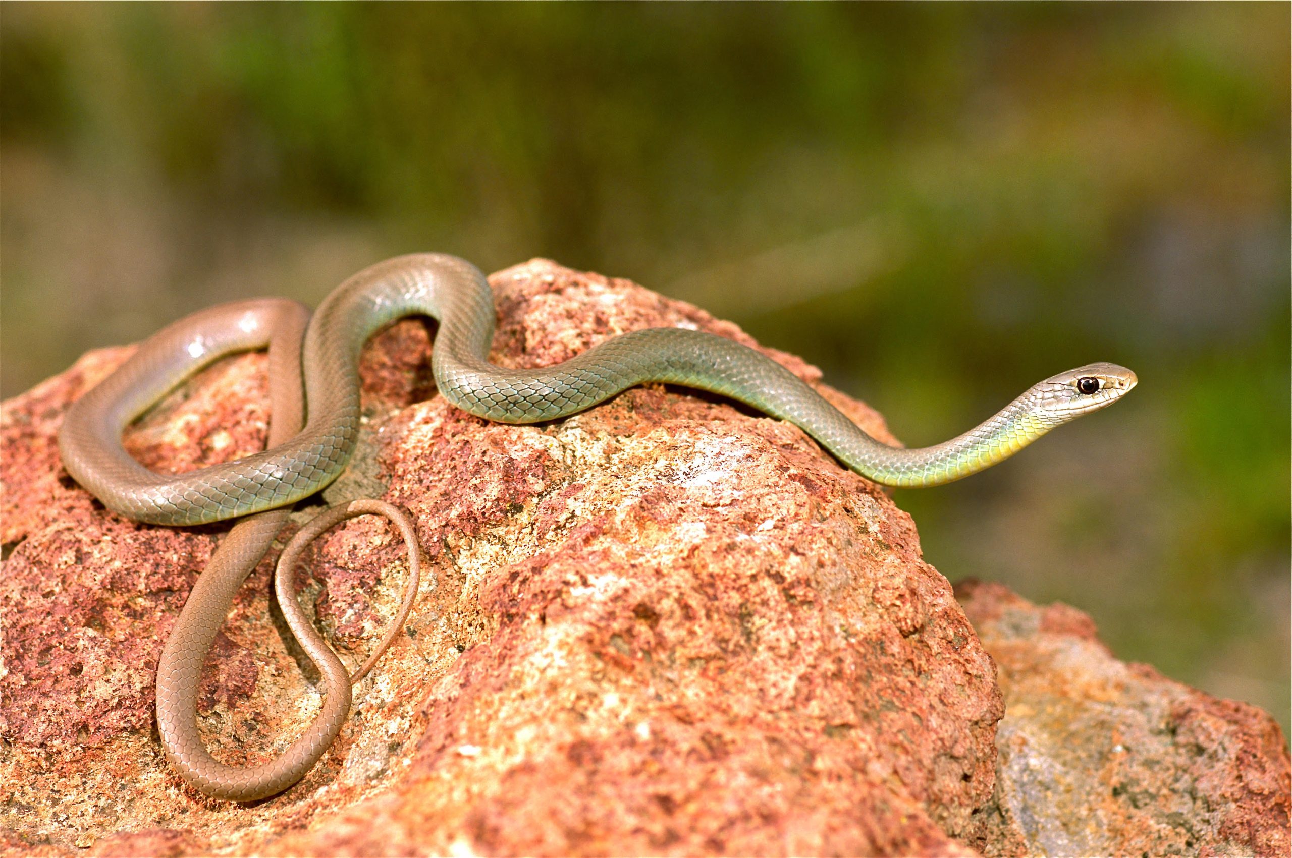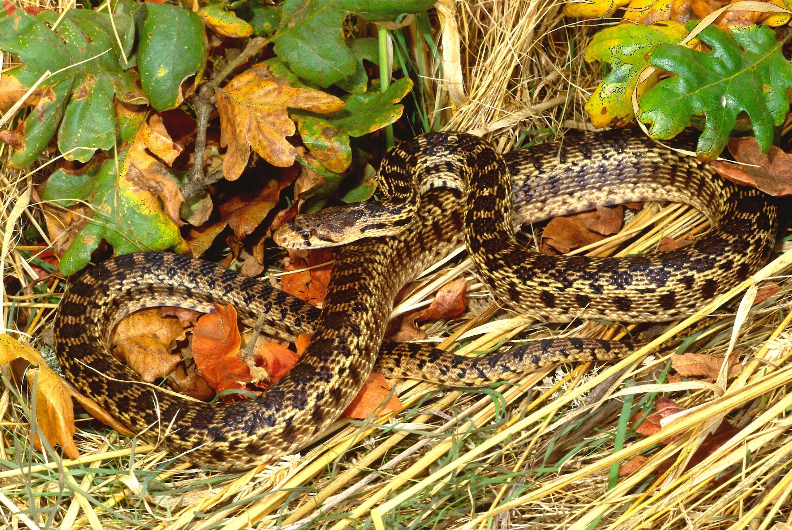 As its name suggests, this species is agriculturally valuable, eating gophers and other small mammals, such as mice, rats, moles and squirrels. Constriction is used to subdue prey. Also often called a “bull snake” or “blow snake” because when defensive it hisses loudly, coiling and flattening the head while nervously vibrating its tail. This threatening display, combined with its blotched pattern, sometimes causes people to erroneously think it’s a venomous rattlesnake——often ending with the Gopher Snake being needlessly killed.