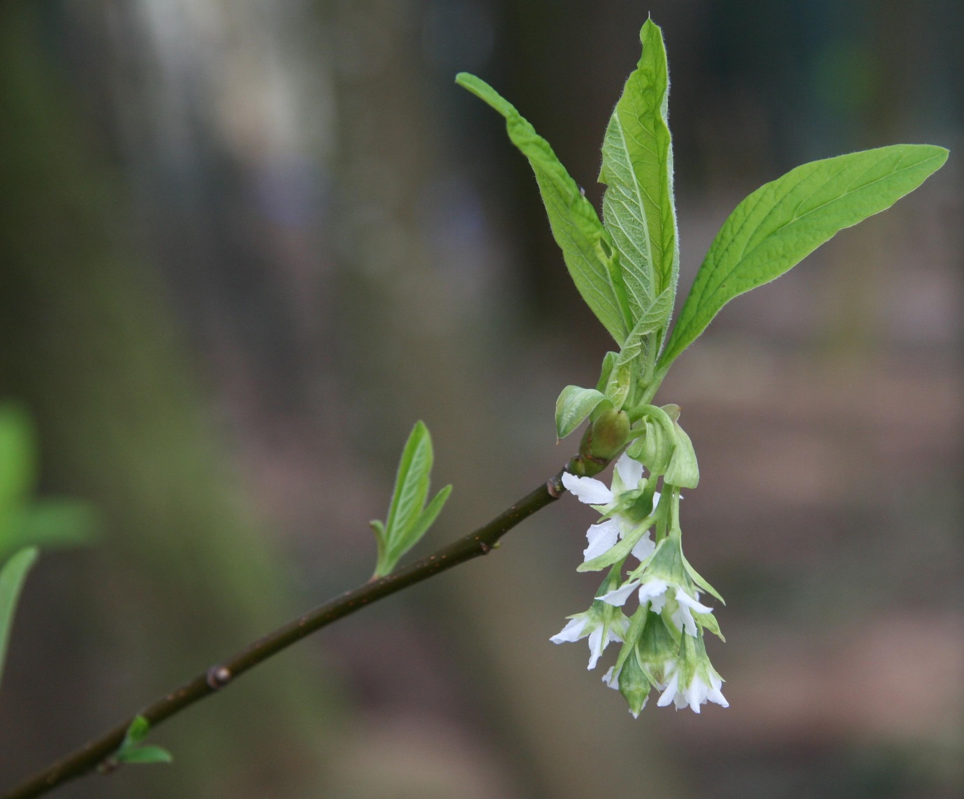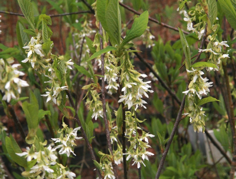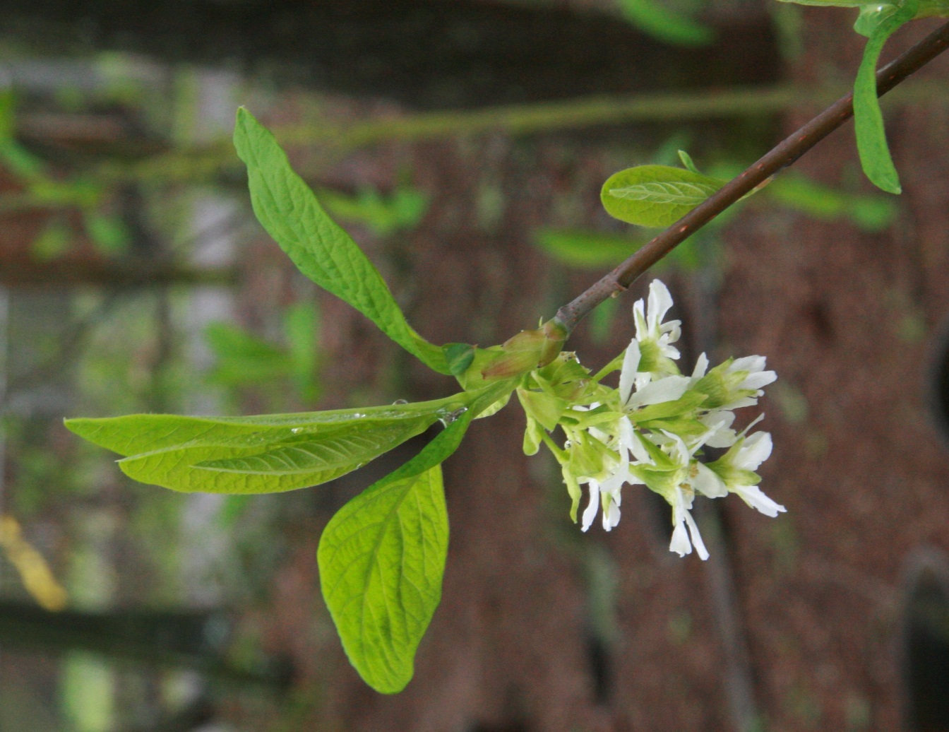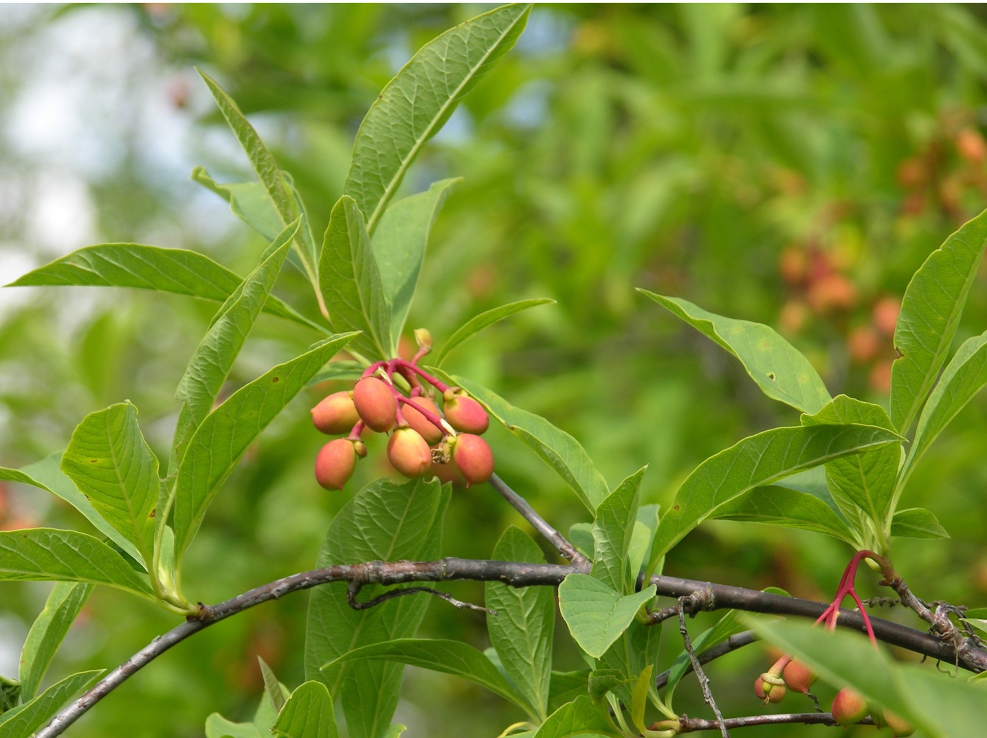 ID Notes: Upright, multi-stemmed. Drooping, white flower clusters will open in early spring before leaves open. Leaves are oblong and soft. Produces cherry like fruit which starts out orange and turns reddish-purple. Can be considered a small tree.