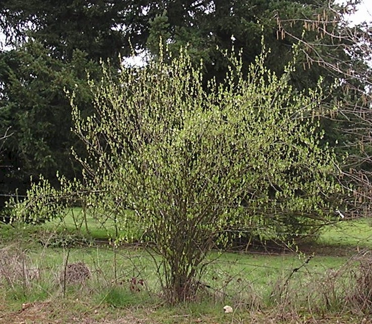 One of the first plants to bloom (Jan or Feb). White flowers yield small purple edible plums. Highly sought by birds. (Also known by the common name Indian Plum.)